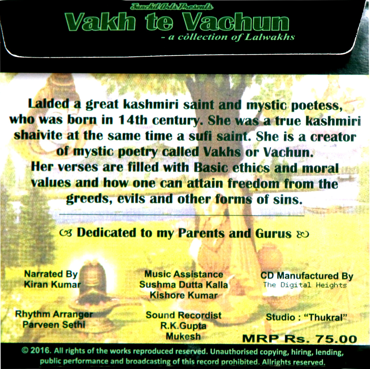 The painting of LalDed depicted here in this advertisement has a copy right with Dr Kanayalal Raina. Original painting is still the property of Dr Kanayalal Raina. No permission was granted by Dr Kanayalal Raina to the singer Sushma Ji to use the painting in her albums.